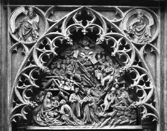 The Liebfrauenkirche (Church of our Lady) was donated by Wigel von Wanebach in the second decade of the 14th century. There is still a nice tombstone from 1322 inside the church. The original tiny building was enlarged in the 15th century. Only the south side was exposed (until the Liebfrauenstrasse was built to connect the square to the Zeil in 1855), and this remains its best side, with a proud row of windows, each with different late gothic fretwork. The roof was renewed in baroque times, and the little gables that topped the large windows were removed. The little east portal of 1415, on the south side was especially admired because of its fine depiction of the Adoration of the Magi. 2. Jahrzehnt des 14. Jh. von Wigel von Wanebach gestiftet; sein schöner Grabstein von 1322 im Innern der Kirche. Der ursprünglich nur sehr kleine Bau im 15. Jh. erweitert. Nur die Südseite lag frei - die Liebfrauenstraße ist erst 1855 nach der Zeil durchgebrochen -und zeigt als Schauseite eine prachtvolle Reihe großer Fenster mit höchst geistreichem, von Fenster zu Fenster wechselndem, spätgotischen Maßwerk. Das Dach mit dem Hauptgesims barock erneuert, dabei die Reihe der kleinen Zwerchgiebel, die sich ursprünglich über den Fenstern erhob, entfernt. Besonders bemerkenswert das kleine östliche Portal der Südseite mit einer reizvollen, fein und liebenswürdig erzählenden Anbetung der Könige im Bogenfeld, um 1415 entstanden.
